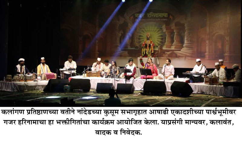 आषाढी एकादशीचे निमित्त साधून कलांगण प्रतिष्ठाण, श्री स्वामी समर्थ मंदिर व अन्नछत्र यांच्या सहकार्यातून कुसूम सभागृहात अॅड.गजानन पिंपरखेडे यांच्या संकल्पना, निर्मिती व निवेदनातून गजर हरिनामाचा हा कार्यक्रम सादर करण्यात आला. या कार्यक्रमात पुण्याच्या चैतन्य कुलकर्णीने, मुंबईच्या आसावरी जोशी (बोधनकर) या प्रख्यात गायकांनी दर्जेदार रचना सादर करुन रसिकांना विठ्ठल भक्तीत मंत्रमुग्ध केले. सोबतच मराठवाड्याचा प्रख्यात गायक विलास गारोळे, गायिका सौ.रागिनी जोशी, उमेश मेगदे आणि विजय जोशी यांनी देखील जुन्या व दुर्मिळ विठ्ठल भक्तीच्या रचना सादर करुन कार्यक्रमात रंगत आणली.
