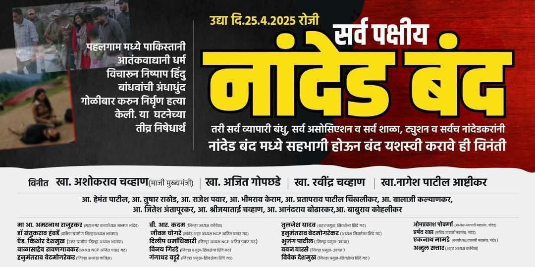 नांदेड। पहलगाम मध्ये पाकिस्तानी आतंकवाद्यानी धर्म विचारून निष्पाप हिंदु बांधवांची अंधाधुंद गोळीबार करुन निघृण हत्या केली. या घटनेच्या तीव्र निषेधार्थ दिनांक 25 रोज शुक्रवारी नांदेड बंदचे आवाहन करण्यात आले आहे.