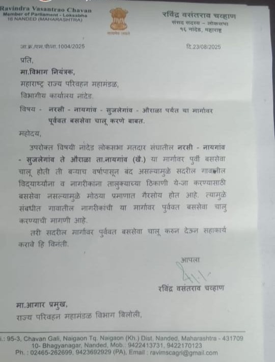 औराळा (प्रतिनिधी) अनेक वर्षांपासून बंद असलेली औराळा–सुजलेगाव–नायगाव–नरसी बस सेवा खासदार रविंद्र चव्हाण यांच्या प्रयत्नातून पुन्हा सुरू झाली आहे. या बस सेवेच्या आगमनाने गावात आनंदाचे वातावरण निर्माण झाले आहे.
