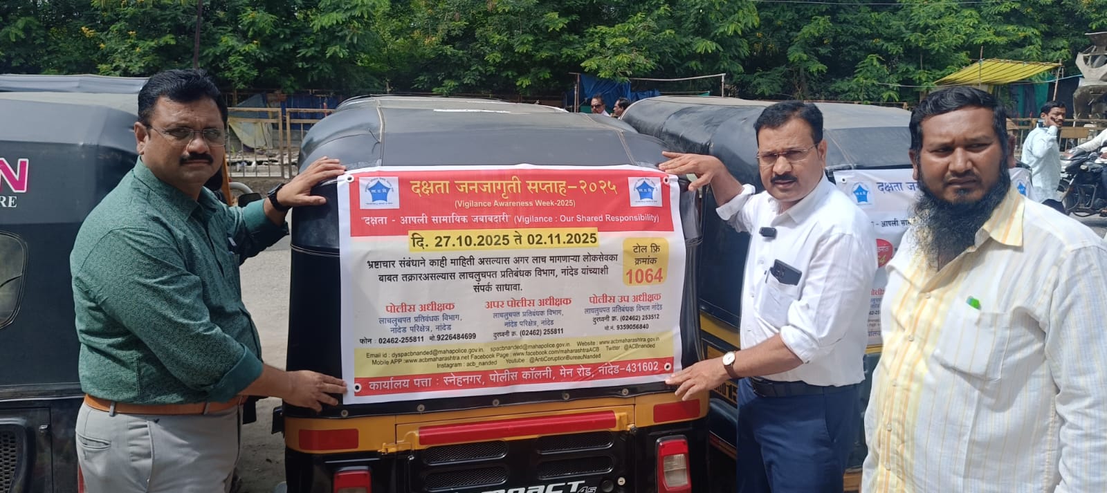 नांदेड| महाराष्ट्र राज्य शासनाकडून 27 ऑक्टोबर 2025 ते 2 नोव्हेंबर 2025 या कालावधीत “दक्षता जनजागृती 2025″ दक्षता आपली सामायिक जबाबदारी” आयोजित करण्यात आला आहे. या अनुषंगाने आज लाचलुचपत प्रतिबंधक विभाग, नांदेड टायगर ग्रुप अँटो संघटनेच्या रिक्षावर जनजागृती सप्ताह 2025 चे फलक लावून सर्व रिक्षांना जनजागृतीसाठी नांदेड शहरात रवाना करण्यात आले.