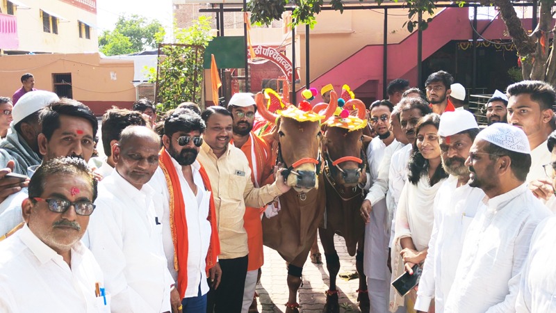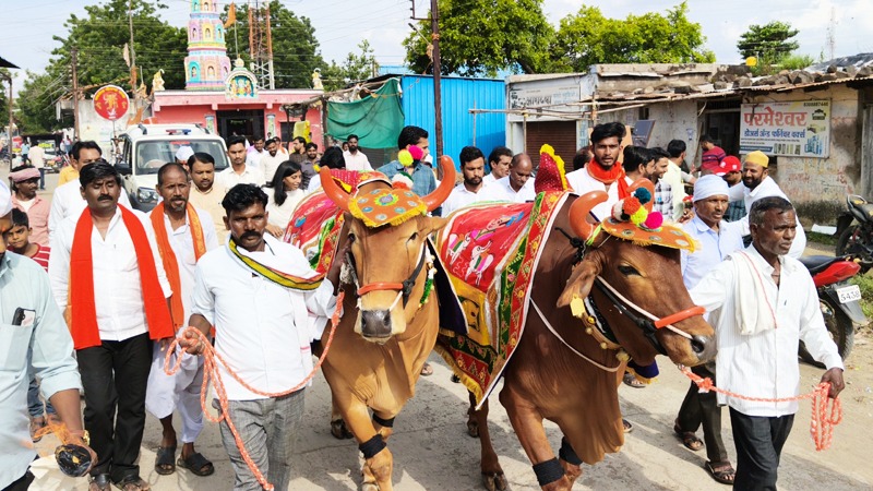 हिमायतनगर, अनिल मादसवार| अतिवृष्टीच्या संकटाने सर्व काही नष्ट होऊन शेतकरी आर्थिक अडचणीत असतानाही भारतीय परंपरेनुसार साजरा होणारा वृषभराजाचा पोळा हिमायतनगरात उत्साहात पार पडला. नगरपंचायतीच्या मानाच्या बैलजोडीची मिरवणूक ढोल-ताश्यांच्या गजरात शहरातुन काढण्यात आली.