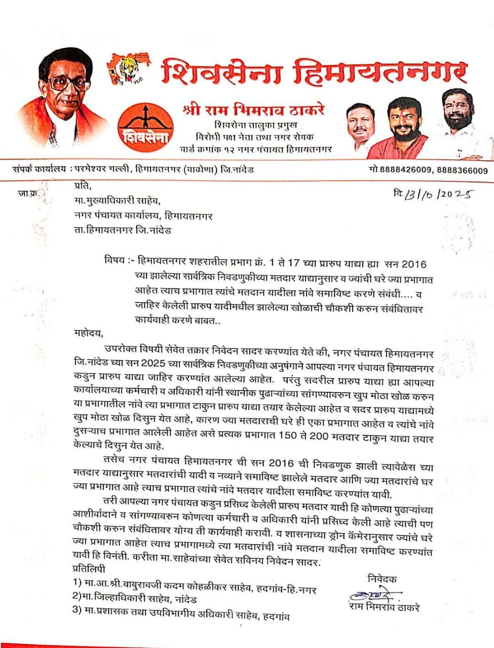 शिवसेना शिंदे गटाचे हिमायतनगर तालुका प्रमुख तथा नगराध्यक्ष पदासाठी निवडणूक लढविण्याच्या तयारीत असलेले राम भिमराव ठाकरे यांनी प्रशासनाकडे दाखल केलेल्या तक्रार निवेदनात म्हटले आहे की, सन 2016 च्या सार्वत्रिक निवडणुकीतील मतदार यादीचा आधार न घेता, काही कर्मचारी व अधिकारी यांनी स्थानिक पुढाऱ्यांच्या सांगण्यावरून घरे एका प्रभागात असताना 150 ते 200 मतदारांची नावे दुसऱ्याच प्रभागात समाविष्ट केली आहेत. हा प्रकार प्रत्येक प्रभागात आढळत असल्याचा दावा करण्यात आला आहे.