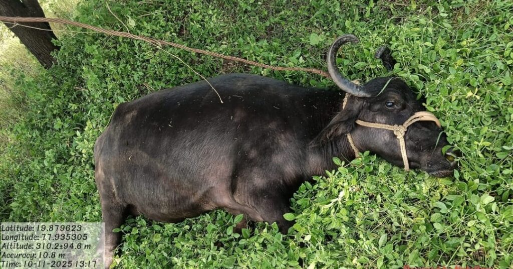 श्रीक्षेत्र माहूर, इलियास बावानी| माहूर तालुक्यातील मौजे लिंबायत येथील चेतन कुमार धनावत यांचे वडील दि.11/10/2025 रोजी सकाळी 12:00 वा शेतशेजारी असलेले प्रमोद मोरे यांच्या शेतातील बांधावर न्हैस काळ्या रंगाची, शिंगे गोल असलेली, वय 5 वर्षाची किंमत 1,50,000/-रु, असुन, यावेळी म्हशीला चारत असतांना म्हैस मराविम कंपनीच्या खांबाला असलेल्या ताराला लागली असता म्हशीला शॉक लागल्याने ती जागीच मरण पावली.
