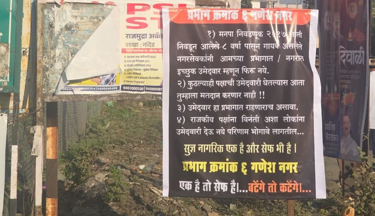 या बॅनरवर शेवटी लिहिलेलं वाक्य नागरिकांच्या भावना अचूक व्यक्त करतं “एक है तो सेफ है… बढ़ेंगे तो कटेंगे!” निवडणुकीच्या पार्श्वभूमीवर नागरिकांची ही भूमिका स्थानिक स्वराज्य संस्थांतील जनतेच्या अपेक्षा आणि जागरूकतेचे दर्शन घडवते. अशा प्रकारचे बॅनर आता इतर प्रभागांमध्येही लावले जाण्याची शक्यता व्यक्त केली जात आहे.