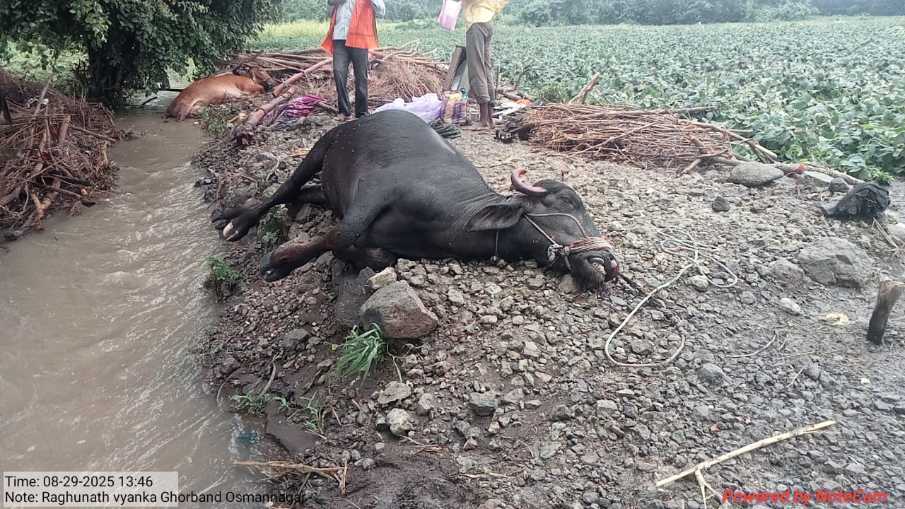 उस्माननगर, माणिक भिसे| उस्माननगर परिसरात दि २७ ते ३० ऑगस्ट दरम्यान ढगफुटी सदृश्य होऊन दिवस रात्र धोधो पाऊस बरसल्याने नदीनाले , कॅनोला प्रचंड भरून शेतातून पाणी वाहत होते. या दरम्यान उस्माननगर येथील शेतकरी रघुनाथ व्यंका घोरबांड यांचे नेहमी सारखे शेताच्या आखाड्यातील दोन बैल वाहत आलेल्या पुरात वाहून गेले, तर एक म्हैस व गाय मृत्यूमुखी अवस्थेत आढळून आली.