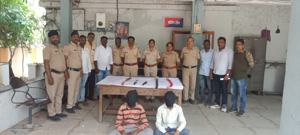 धर्माबाद/नांदेड | स्थानिक गुन्हे शाखेच्या मदतीने धर्माबाद पोलिसांनी एक मोठी कारवाई करत दोन आरोपींना ताब्यात घेऊन त्यांच्याकडून तीन तलवारी आणि दोन खंजऱ्यांचा साठा जप्त केला आहे. ही कारवाई गुप्त माहितीच्या आधारे करण्यात आली असून, शहरात अनुचित घटना घडू नये यासाठी पोलिसांनी दक्षता घेत ही शस्त्रसाठा पकडला.