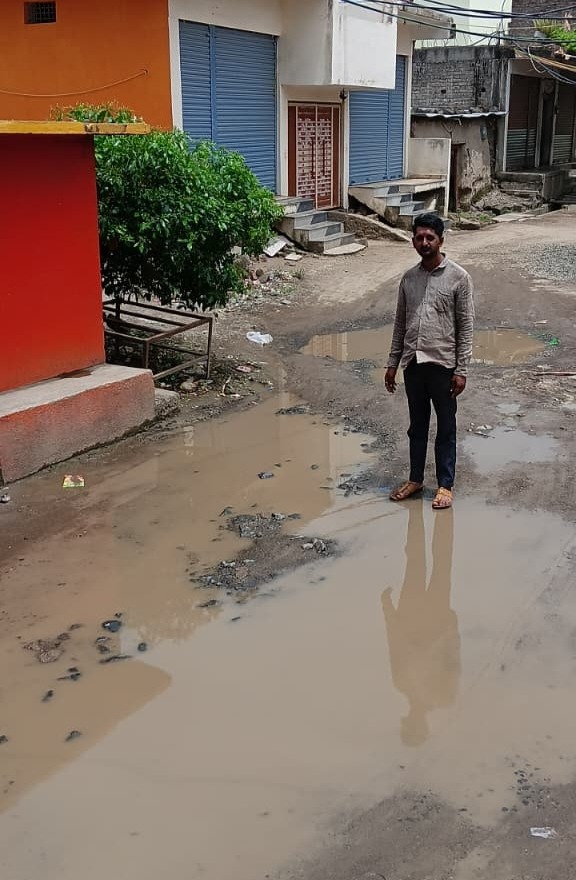 Dirty rainwater on the road in front of Tukamai Temple in Himayatnagar