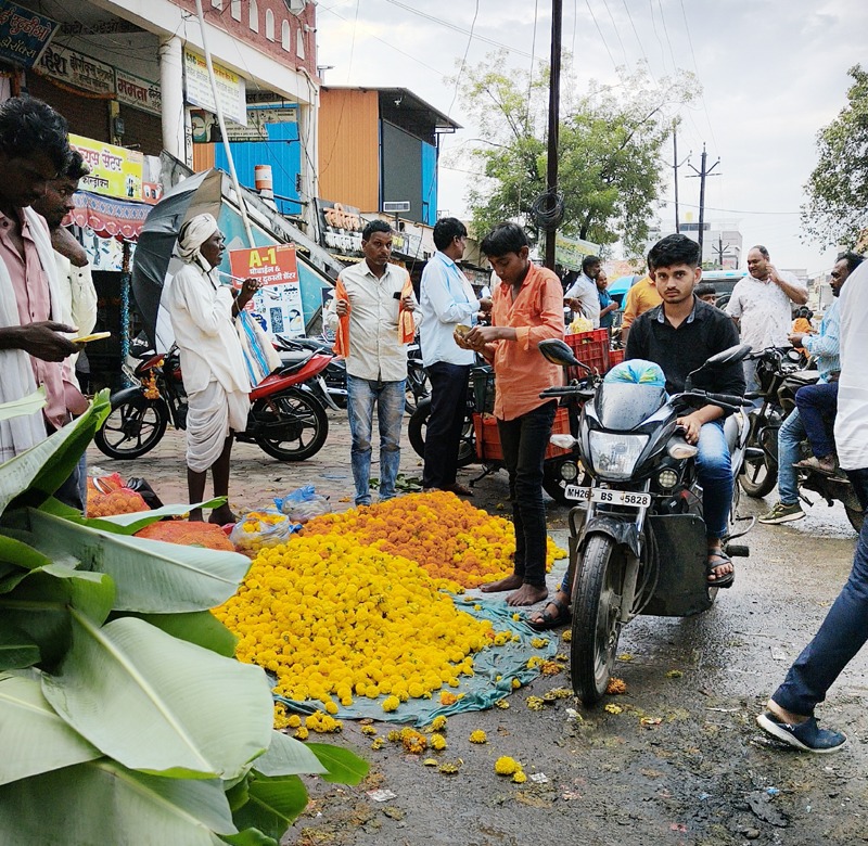 लक्ष्मीपूजनाच्या दिवशी झालेल्या जोरदार पावसामुळे झेंडू फुलांच्या भावावर पाणी फिरले. सकाळी ३० ते ५० रुपये किलो तर सायंकाळी फक्त १० ते २० रुपये किलो एवढाच दर मिळाल्याने शेतकऱ्यांना मोठा फटका बसला आहे. मेहनतीने तयार केलेली फुले विकूनही खर्च निघत नसल्याने शेतकरी निराश झाले आहेत.