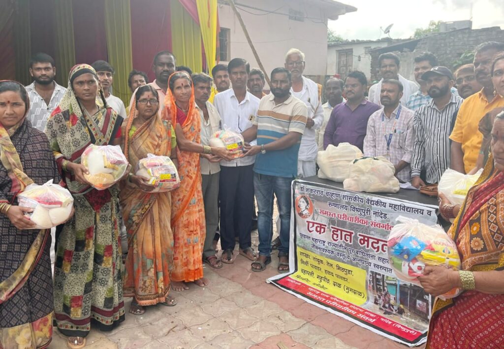 नवीन नांदेड l डॉ.शंकरराव चव्हाण शासकीय वैद्यकीय महाविद्यालय रुग्णालय विष्णुपुरी नांदेड येथील परिचारिकांच्या वतीने परिचारिका संघटनेच्या माध्यमातून पूरग्रस्तांना जीवनावश्यक वस्तूंच्या अन्नधान्य 200 किटचे वाटप सामाजिक बांधिलकी जोपासत केले असून या उपक्रमाचे अनेकांनी अभिनंदन केले आहे.