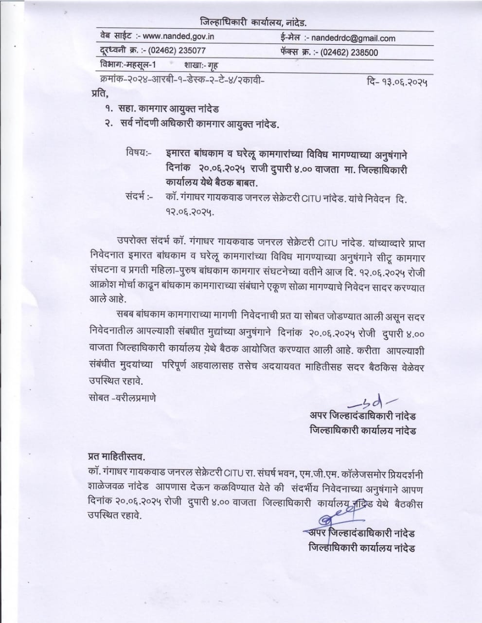नांदेड| अप्पर दंडाधिकारी महेश वडदकर यांनी सीटू कामगार संघटनेच्या मोर्चाची दखल घेतली असून २० जून रोजी सहाय्यक कामगार आयुक्त व सर्व सरकारी कामगार अधिकारी यांना जिल्हाधिकारी कार्यालय येथे बैठकीला बोलावण्यात आले आहे.