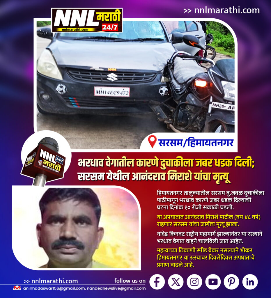 हिमायतनगर| तालुक्यातील मौजे सरसम बु. गावाजवळ दुचाकीला पाठीमागून येणाऱ्या भरधाव वेगातील कारणे दुचाकीला जबर धडक दिल्याची घटना आज दिनांक १० रोजी सकाळी घडली आहे. या घटनेत आनंदराव मिराशे पाटील (वय ४८ वर्ष) यांचा जागीच मृत्यू झाला आहे.