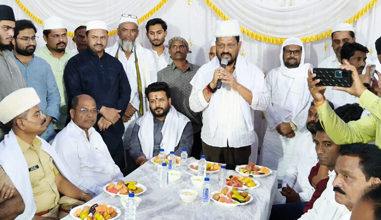 हिमायतनगर, अनिल मादसवार| पवित्र रमजान महिन्याच्या पार्श्वभूमीवर हिमायतनगर शहरात आयोजित करण्यात आलेल्या दावते-इफ्तार कार्यक्रमातून हिंदू-मुस्लिम ऐक्याचा प्रभावी संदेश देण्यात आला. लोकनियुक्त नगराध्यक्ष तथा प्रतिष्ठित व्यापारी शेख रफीक शेख महबूब यांच्या पुढाकारातून गेल्या दहा वर्षांपासून हा उपक्रम सातत्याने राबविला जात असून, यंदाही मोठ्या उत्साहात कार्यक्रम पार पडला.