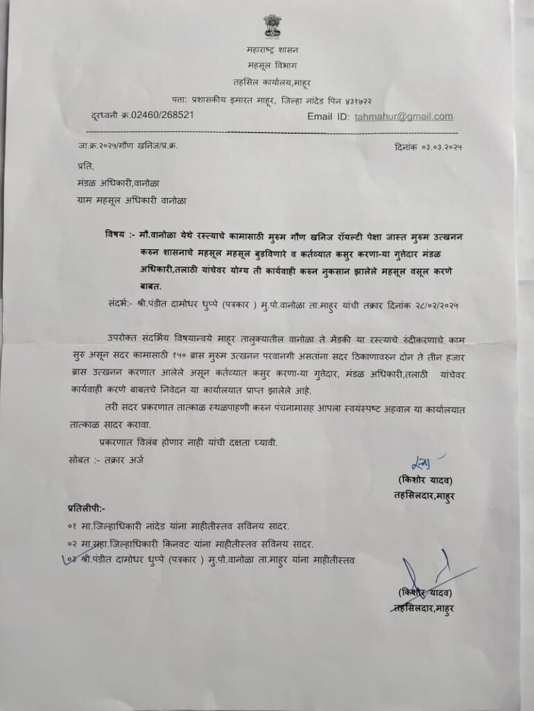 शासनाचा महसूल बुडविणाऱ्या व गौण खनिज चोरी करणाऱ्या संबधित कंत्राटदाराविरुद्ध कारवाई करावी व सदर अवैध मुरूम उत्खननाकडे जाणीव पूर्वक दुर्लक्ष करून कर्तव्यात कसून करणाऱ्या संबंधीत तलाठी व मंडळ अधिकारी यांचे विरुद्ध निलंबनाची कारवाई करण्याची मागणी केली आहे. निवेदनाच्या अनुशंगाने तहसीलदार किशोर यादव यांनी दि.३ मार्च रोजी मंडळ अधिकारी व ग्राम महसूल अधिकारी वानोळा यांना सदर अवैध मुरूम उत्खन प्रकरणी स्थळपाहणी करून चौकशी करून पंचनामा सह अहवाल सादर करण्याचे आदेश दिले आहेत.