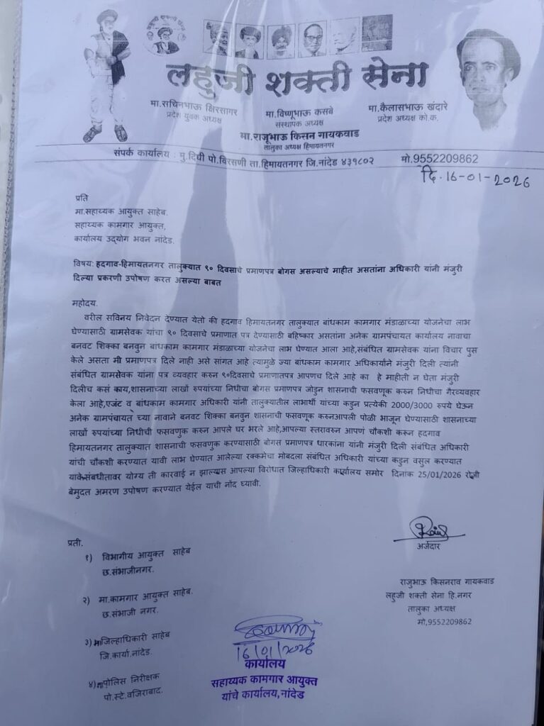 हिमायतनगर/हदगांव | हदगाव–हिमायतनगर तालुक्यात बांधकाम कामगार मंडळाच्या योजनेत मोठ्या प्रमाणावर गैरव्यवहार झाल्याचा गंभीर आरोप समोर आला असून, बोगस प्रमाणपत्रांना मंजुरी देणाऱ्या संबंधित अधिकाऱ्यांना तात्काळ निलंबित करण्यात यावे, अशी ठाम मागणी करण्यात आली आहे. अन्यथा २७ जानेवारी २०२६ पासून जिल्हाधिकारी कार्यालयासमोर बेमुदत अमरण उपोषण करण्याचा इशारा देण्यात आला आहे.