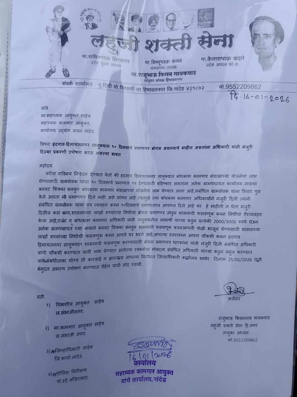 या सर्व मागण्यांचे निवेदन लहुजी शक्ती सेना हिमायतनगर तालुका अध्यक्ष राजू गायकवाड यांनी १६ जानेवारी २०२६ रोजी सहाय्यक आयुक्त (कामगार) कार्यालय व जिल्हाधिकारी, नांदेड यांच्याकडे सादर केले आहे.
