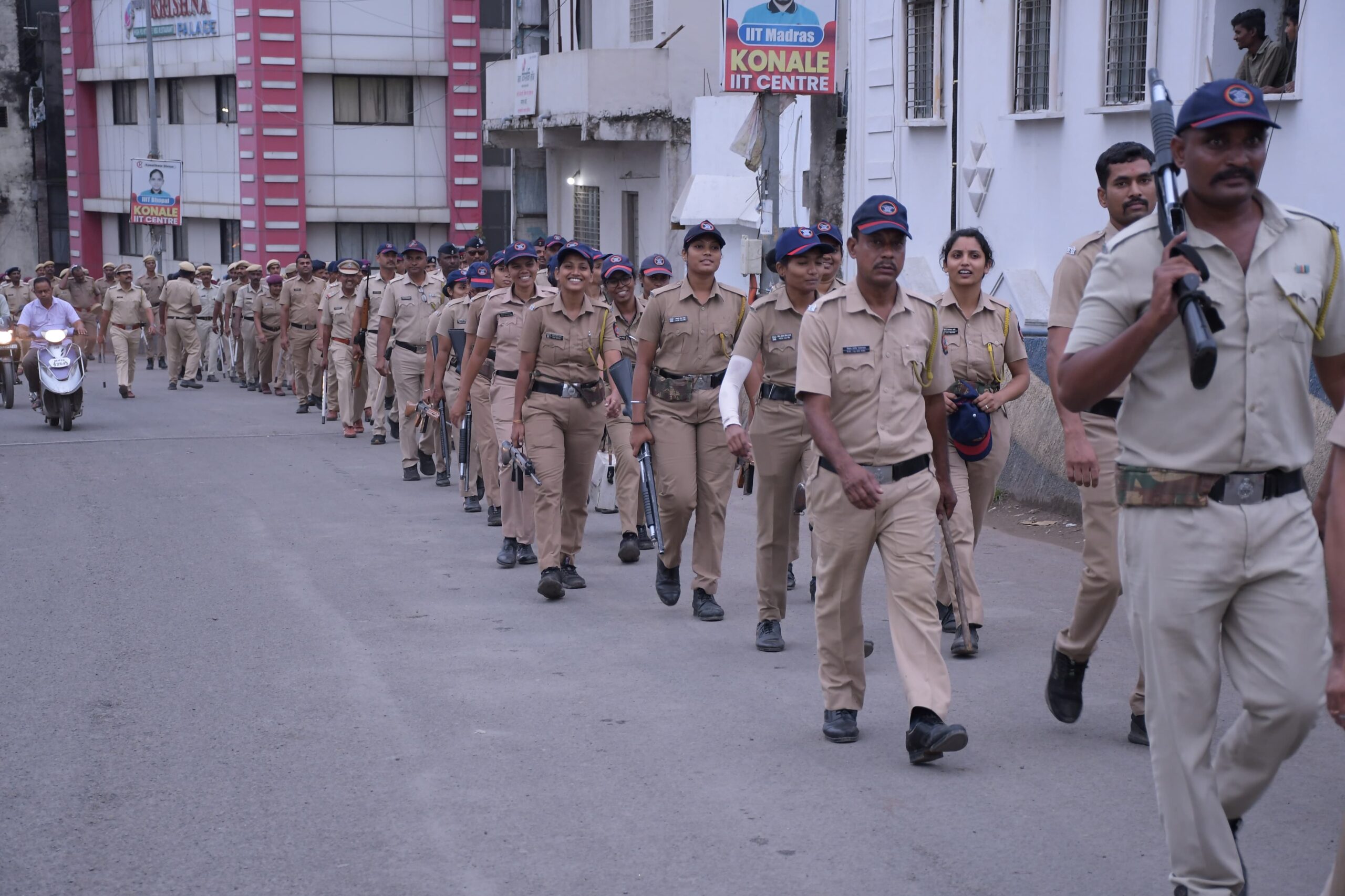 नांदेड, गोविंद मुंडकर| गणेशोत्सव विसर्जन शांततेत पार पाडण्यासाठी नांदेड पोलिसांनी पथसंचलन केले. मा. अविनाश कुमार, पोलीस अधीक्षक, नांदेड यांच्या मार्गदर्शनाखाली हे पथसंचलन शहरातील इतवारा पोलीस स्टेशन – इतवारा बाजार – सराफा – बर्की चौक – जुना मोंढा – वजीराबाद कलामंदिर – शिवाजी नगर – आयटीआय चौक या मार्गावर पार पडले.
