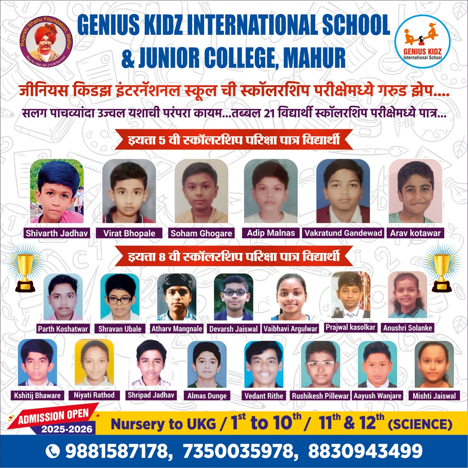 सर्वच स्पर्धा परीक्षेत जीनियस स्कूलचे विद्यार्थी चमकत आहेत. स्कॉलरशिप पात्र यशवंत, गुणवंत, ज्ञानवंत विद्यार्थ्यांचे सर्वच स्तरातून कौतुक होत आहे. मागच्या वर्षी देखील याच शाळेची विद्यार्थिनी ईयत्ता दहावी वर्गातून तालुक्यातून प्रथम आली होती. दरवर्षी शैक्षणिक आलेख उंचावत आहे ‌.माहूर तालुक्यातून शैक्षणिक गुणवत्तेसाठी जिनीयस इंग्रजी स्कूल अव्वल ठरली आहे.