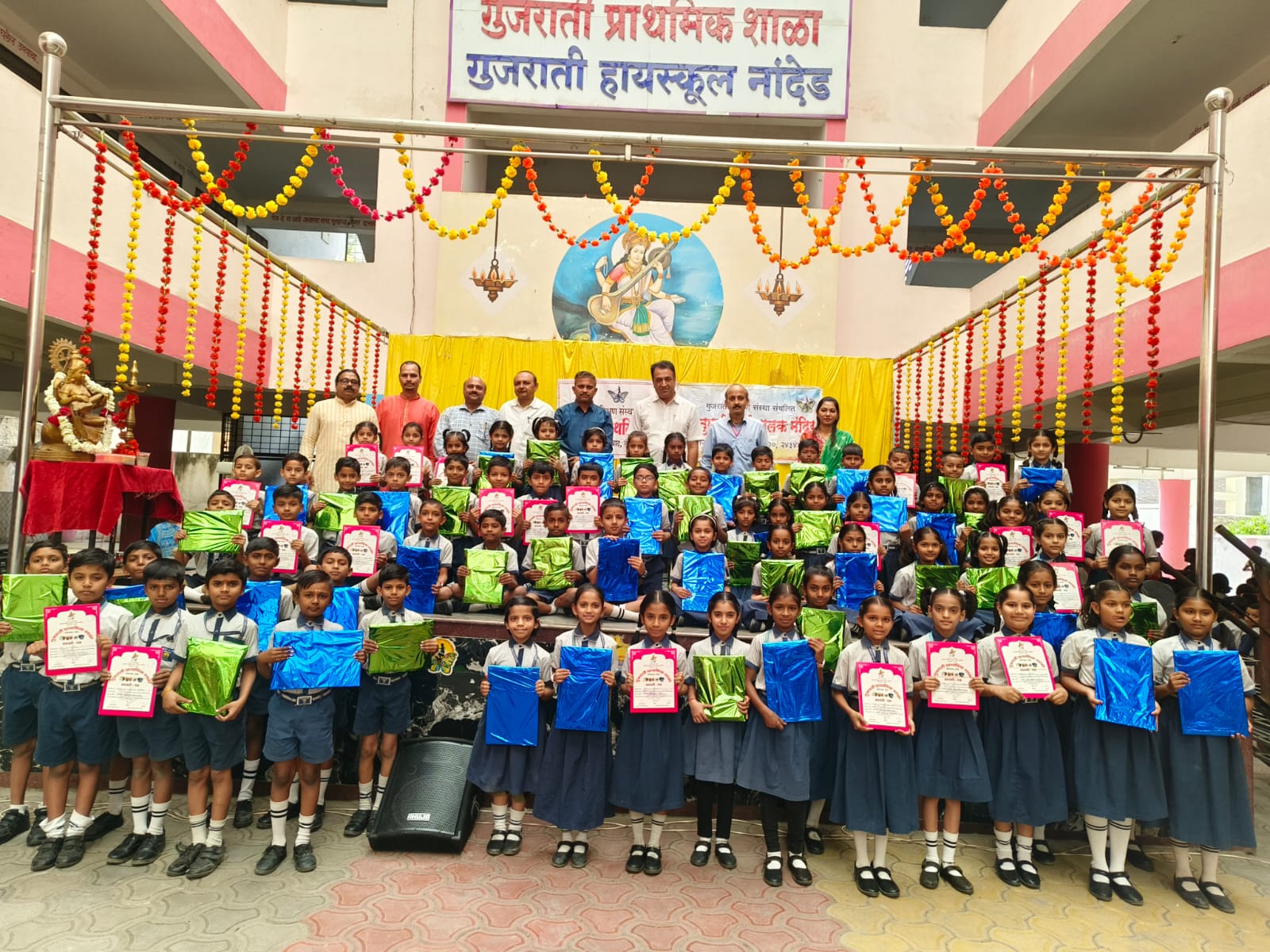 नांदेड l गुजराती प्राथमिक शाळेत वर्षभरात विविध स्पर्धा घेण्यात आल्या. त्यात पहिली ते चौथीच्या विद्यार्थ्यांच्या सुप्त गुणांना वाव मिळाला. विद्यार्थ्यांनी मोठ्या उत्साहाने स्पर्धेत सहभाग नोंदवला व बक्षीस पटकावले. यानिमित्त विद्यार्थ्यांचा उत्साह वाढावा व त्यांच्या कलागुणांना प्रोत्साहन देण्यासाठी आज ता 18 रोजी शाळेत बक्षीस वितरण सोहळा कार्यक्रम आयोजन करण्यात आले. छोट्या चिमुकल्यांनी आनंदात बक्षीस घेतले. इयत्ता चौथीच्या विद्यार्थ्यांनी पाहुण्यांचे स्वागत हे स्वागत गीताने केले.