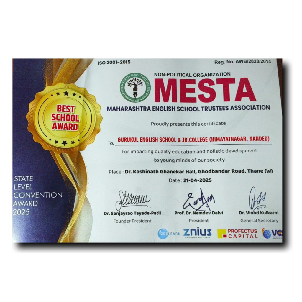 ठाणे येथील डॉ काशीनाथ घाणेकर नाट्यगृह हिरानंदानी मेडयुज येथे महाराष्ट्र इंग्लीश स्कुल ट्रस्टीज असोसिएसन मार्फत शैक्षणीक वर्ष 2024-25 करीता गुरुकुल इंग्लीश स्कुल अँड ज्यु. कॉलेजला सर्वोत्कृष्ठ शाळा पुरस्काराने गौरविण्यात आले आहे. हि शाळा ग्रामीण भागात येत असली तरीही उज्वल भविष्यासाठी वर्षभर विविध उपक्रम राबवून विद्यार्थी घडविण्यासाठी प्रयत्न करत असते.