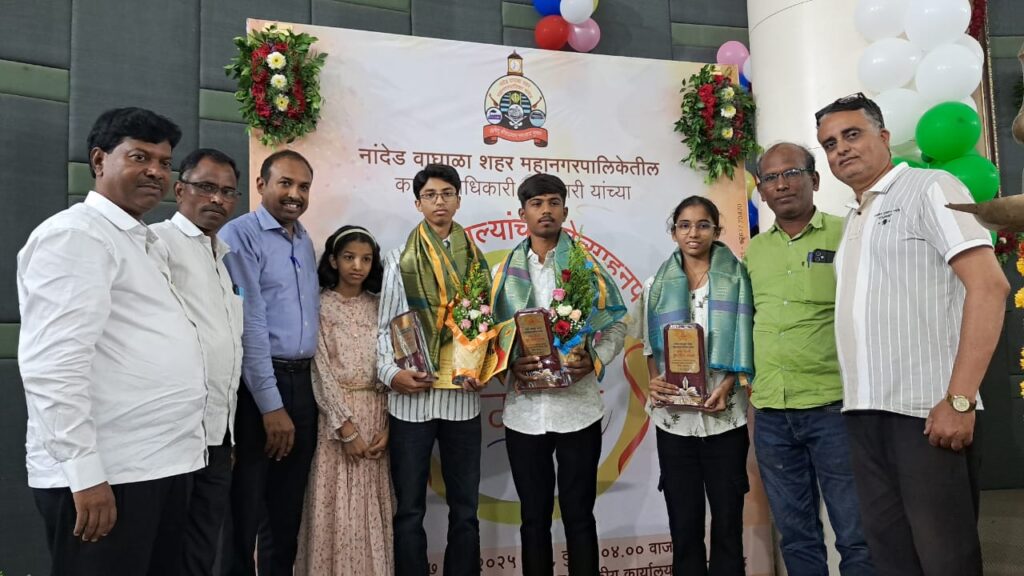 यावेळी सिडको क्षेत्रीय कार्यालय येथील सहाय्यक आयुक्त डॉ मिर्झा बेग यांच्या चि. आयन ,वसुली लिपीक मारोती सारंग यांच्यी मुलगी कल्याणी वसुली लिपीक मालु एनफळे यांच्या मुलगा शिवकुमार व लिपिक अर्चना जोंधळे यांच्यी मुलगी प्राजक्ता यांच्या सन्मान चिन्ह, प्रमाणपत्र,रोख रक्कम धनादेश पुष्प गुच्छ देऊन सत्कार करण्यात आला. मनपाच्या वतीने सन्मान झाल्याबद्दल नवीन नांदेड मराठी पत्रकार संघाचे माजी अध्यक्ष रमेश ठाकूर व छायाचित्रकार सारंग नेरलकर यांनी सत्कार करून शुभेच्छा दिल्या.