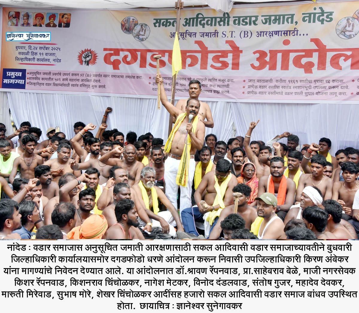 रानावनाने दगड फोडून डोंगरदऱ्या कोरत मातीकाम करून दळणवळणाची रस्ते, मोठमोठी सिंचनाची धरणे आणि टोलेजंग प्रशासकीय इमारती बांधणारा वडार समाज आज वडार समाज नेते डॉ.श्रावण रॅपनवाड यांच्या नेतृत्वात प्रा. साहेबराव बेळे, नागेश मेटकर, विनोद दंडलवाड, मारुती मिरेवाड यांच्या संयोजनातून आज सकल आदिवासी वडार जमात नांदेड च्या बॅनरखाली जिल्हाधिकारी कार्यालयासमोर नांदेड,हिंगोली,परभणी, जालना येथील हजारो वडार युवक व प्रतिनिधी अर्धनग्न होऊन प्रतीकात्मक दगडफोडो आंदोलन केले.