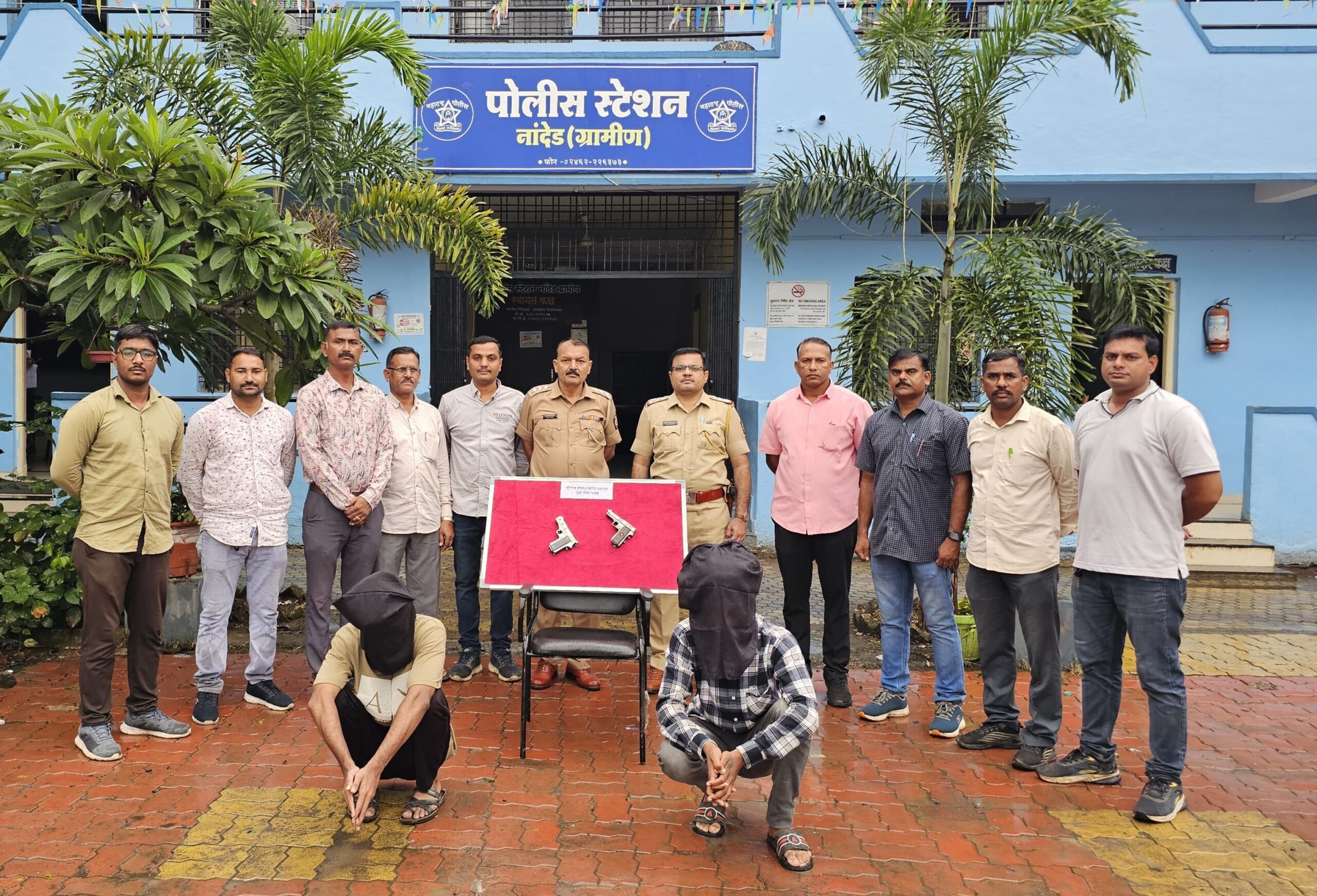 पोलीस सुत्रांनी दिलेल्या माहितीनुसार,जिल्हा पोलीस अधीक्षक अबिनाश कुमार यांच्या आदेशानुसार, इतवारा उपविभागाचे पोलीस उपअधिक्षक प्रशांत शिंदे, नांदेड ग्रामीणचे पोलीस निरिक्षक ओमकांत चिंचोळकर यांच्या मार्गदर्शनाखाली पोलीस उपनिरिक्षक बाबुराव चव्हाण, पोलीस अंमलदार अर्जुन मुंडे, शंकर माळगे, गवेंद्र सिरमलवार, नितीन गंगलवाड, समिर आणि शिरगिरे यांनी 25 सप्टेंबर रोजी मिळालेल्या माहितीनुसार अरफाद कॉलनी वसरणी येथे सय्यद शाहीन सय्यद दस्तगिर (21) रा. रहिमपुर वसरणी, बलबिरसिंघ प्रतापसिंघ जाधव (22) रा. वजिराबाद नांदेड, शेख आदील शेख शकील हा फरार आहे. त्यापैकी दोघांना पकडले आणि त्यांच्याकडून 60 हजार रुपये किंमतीचे दोन गावठी पिस्टल जप्त केले. हे दोन गावठी पिस्टल फरार असलेल्या शेख आदील शेख शकीलने विक्री करण्यासाठी दिले होते ,या प्रकरणी तिन जणांविरुद्ध गुन्हा दाखल करण्यात आला आहे.