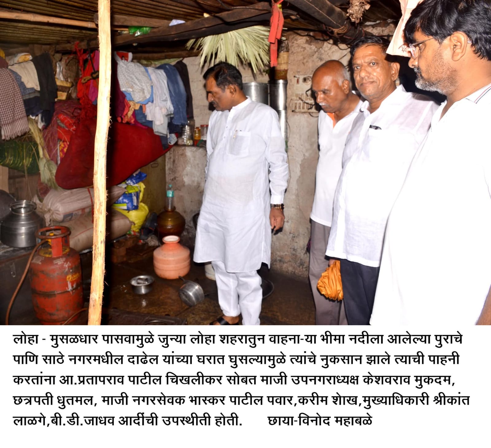 जीवनोपयोगी साहित्य वाहून गेले गोल्डन सिटी भागात चार चाकी, दुचाकी वाहून गेले हीन नैसर्गिक आपत्त उदभवली ढगफुटीमुळे हाहाकार उडाला त्या भागात सकाळीच आमदार प्रतापराव पाटील चिखलीकर यांनी पूरग्रस्त भागात गेले जुन्या शहरातील कलालपेठ, साठे गल्ली , जायकवाडी परिसर भागात नागरिकाच्या झालेल्या नुकसानीचे पाहणी केली. आपल्या सोबत मी आहे काळजी घ्या.सुदैवाने या पुरात कोणीही जीवितहानी झाली नाही .प्रशासन व पदाधिकारी आपल्या मदतीला आहेत. जीवनावश्यक साहित्याचे नुकसान झाले घरात पाणी गेले ,घर पडले, त्याचे पंचनामे करावेत असा सूचना प्रशासनास दिल्या.