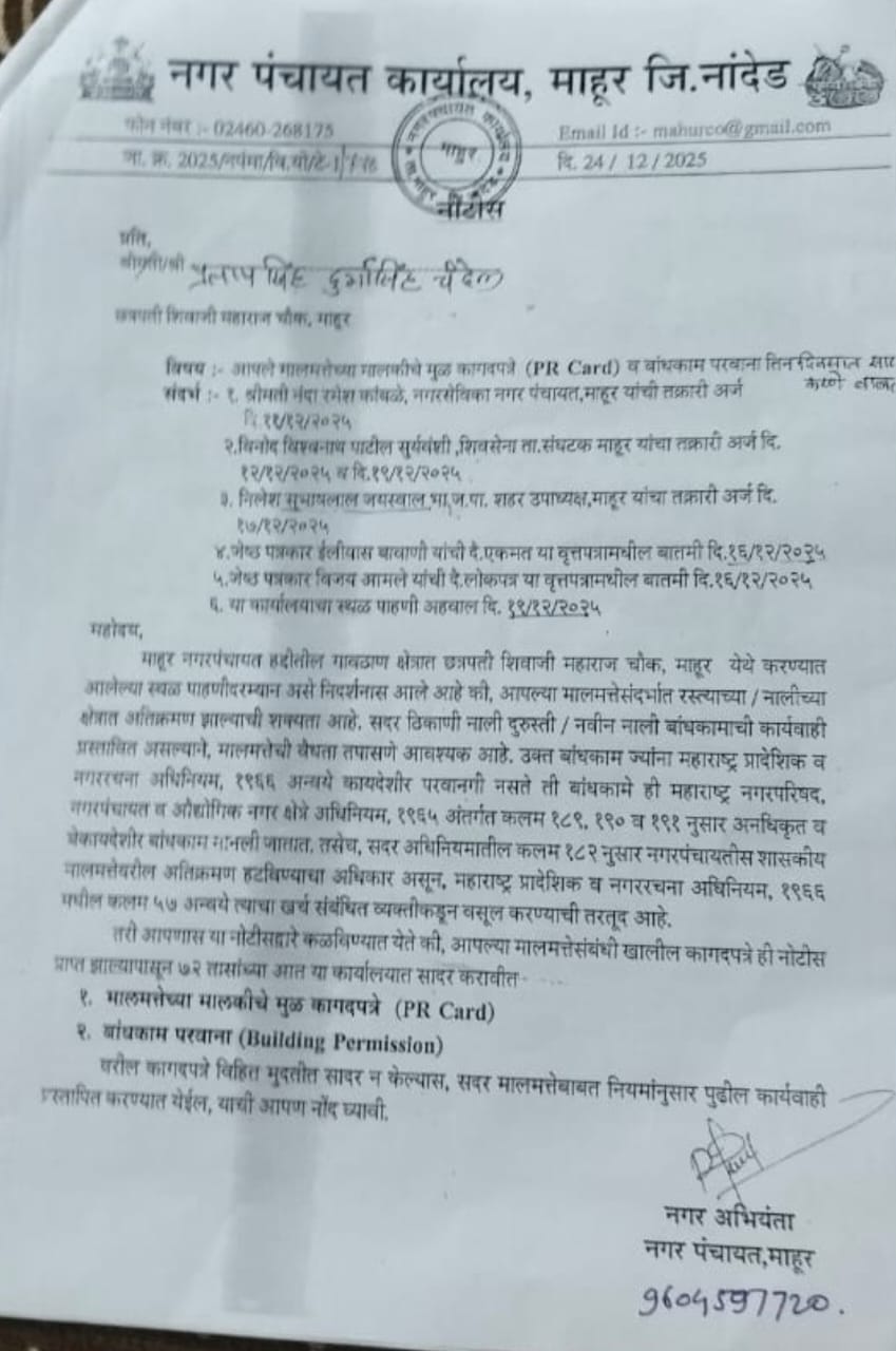 श्रीक्षेत्र माहूर| माहूर नगर पंचायतकडून छत्रपती शिवाजी महाराज चौक परिसरातील व्यापाऱ्यांना अतिक्रमण काढण्यासंदर्भात बजावण्यात आलेल्या नोटीसीमुळे शहरात मोठा वाद निर्माण झाला असून, या नोटीसीमध्ये स्थानिक पत्रकार व वृत्तपत्रांची नावे वापरण्यात आल्याचा गंभीर आरोप करण्यात आला आहे. या प्रकारामुळे पत्रकारांची सामाजिक व व्यावसायिक बदनामी झाल्याचा तसेच व्यापाऱ्यांकडून प्रत्यक्ष व अप्रत्यक्ष धमक्या मिळत असल्याचा दावा करण्यात आला आहे.