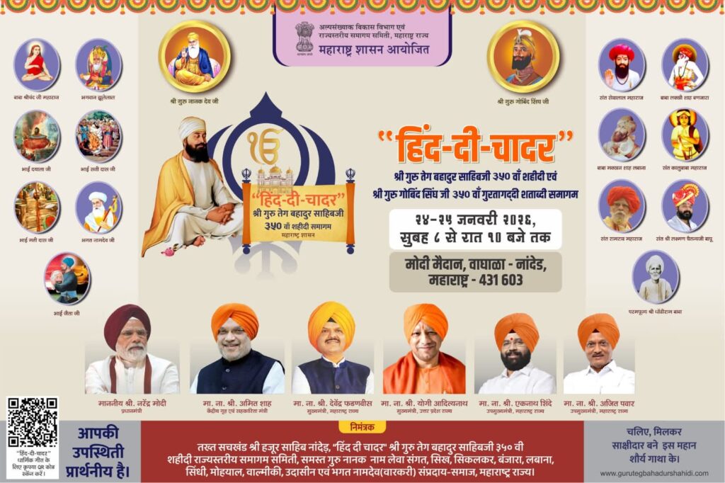 नांदेड | शिखांचे नववे गुरु श्री गुरु तेग बहादुर साहिबजी यांच्या ३५० व्या शहिदी समागम वर्षानिमित्त नांदेड शहरात होणाऱ्या ऐतिहासिक “हिंद-दी-चादर” कार्यक्रमासाठी संपूर्ण शहर सज्ज झाले आहे. जिल्हा प्रशासनाने सर्व तयारी पूर्ण केली असून भाविकांच्या स्वागतासाठी नांदेड नगरी उत्साहात न्हाऊन निघाली आहे.