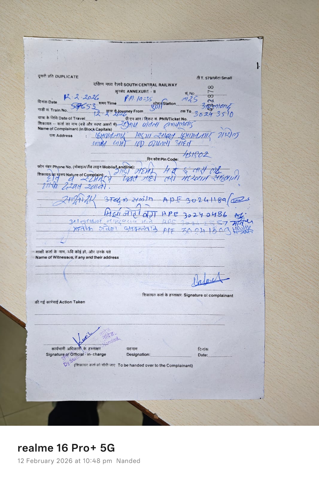 हा प्रकार लक्षात आल्यानंतर हिमायतनगर येथील वार्ड क्रमांक १७ चे नगरसेवक सुभाष पोतन्ना बलपेलवाड यांनी रेल्वे प्रशासनाकडे लेखी तक्रार दाखल केली. यावेळी अब्दुल सलाम, मिर्झा नुही बेग, आत्मराम माने, ऋतिक अक्कलवाड यांच्यासह अनेक प्रवासी उपस्थित होते.