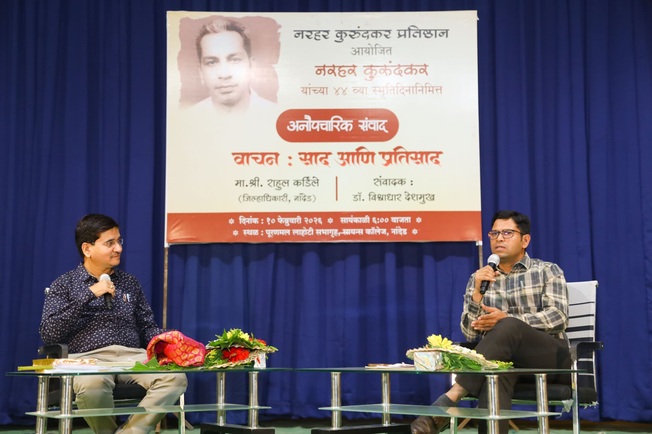 नरहर कुरुंदकर प्रतिष्ठान द्वारा ज्येष्ठ साहित्यिक, विचारवंत नररहर कुरुंदकर यांच्या 44 व्या स्मृतिदिनानिमित्त वाचन: साद आणि प्रतिसाद विषयावर जिल्हाधिकारी राहुल कर्डिले यांच्याशी अनौपचारिक संवाद या कार्यक्रमाचे आयोजन सायन्स महाविद्यालयाच्या पुरणमल लाहोटी सभागृहात करण्यात आले होते. व्यासपीठावर संवादक डॉ. विश्वाधार देशमुख यांची उपस्थिती होती. या संवाद कार्यक्रमात डॉ. विश्वाधार देशमुख यांनी जिल्हाधिकारी राहुल कर्डिले यांना त्यांचा वाचन प्रवास, वाचनाचे महत्त्व, वाचन संस्कृतीचा विकास आणि ऱ्हास आदीवर प्रश्न विचारून बोलते केले.
