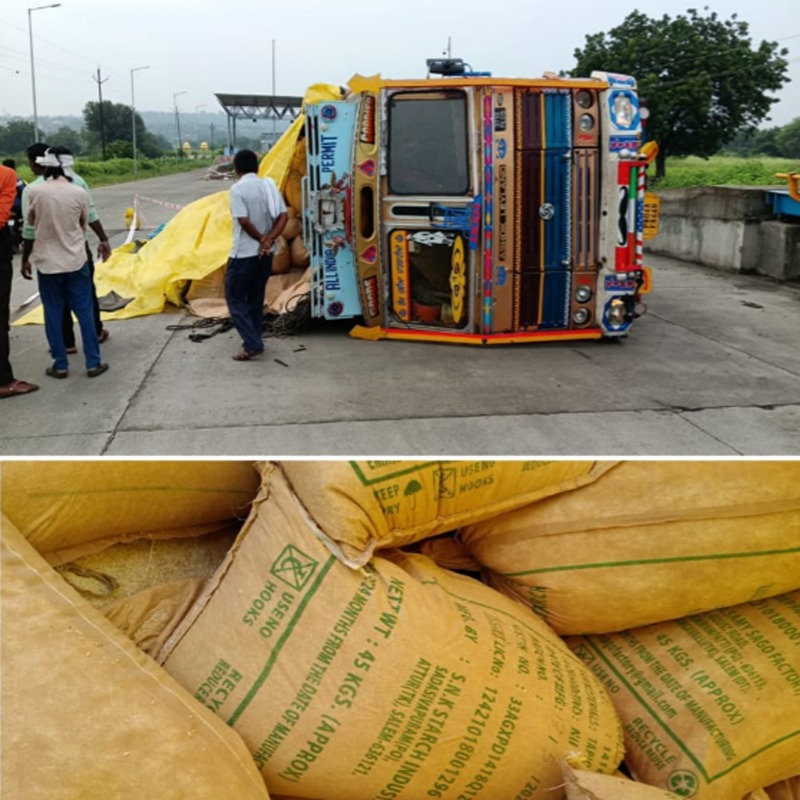 या बाबत घटनास्थळातून मिळालेली माहिती अशी की फुलवळ येथील टोलनाक्यावर अपघाताचा सत्र चालूच आहे या ठिकाणी अनेक अपघात झाले त्यात अनेकांनी जीव ही गमावला. तेव्हा कोणत्या ना कोणत्या कारणाने येथील टोलनाका हा चर्चेचा विषय ठरलेलाच असतो. त्यातच १२ सप्टेंबर रोज शुक्रवारी पहाटेच्या सुमारास ट्रक गाडी क्रमांक (पी.बी.०४ ए.एफ.८४४८ ) मध्ये प्रति ५० किलो वजनाचे अंदाजे ६२० पोते तांदूळ भरून कर्नाटक वरून नांदेड मार्गे गोंदियाकडे जात असताना चालकाच्या अनावधानाने ट्रक वरील ताबा सुटल्याने ट्रक पलटी झाला. ट्रक चालक नामे रामेश्वर उर्फ परमेश्वर बालबाल बचावल्याची माहिती घटनास्थळावरून मिळाली.