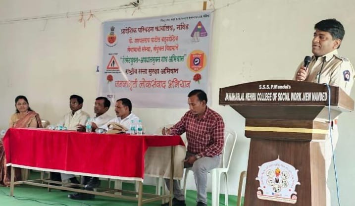 यावेळी सहाय्यक परिवहन अधिकारी आशिष दराडे यांनी राज्य रस्ता सुरक्षा अभियान 2025 अंतर्गत हेल्मेट युक्त अपघात मुक्त गाव अभियान संकल्पनेतून रस्ता सुरक्षा लोकसंवाद कार्यक्रमाच्या सुरुवातीस उपस्थित सर्व मान्यवरांना रस्ता सुरक्षा जनजागृतीची मार्गदर्शिका पुस्तक भेट रुपी देऊन कार्यक्रमाची सुरुवात करण्यात आली.नांदेड जिल्ह्यात दिवसाला पाचशेच्या आसपास अपघातात होतात.जिल्ह्यातील केवळ पाच टक्के लोक रस्ता सुरक्षा नियमांचे व वाहन कायद्याचे पालन करतात.हि अत्यंत चिंताजनक असून या सर्व विषयाचा गांभीर्याने विचार करण्याची अत्यंत गरज आहे.