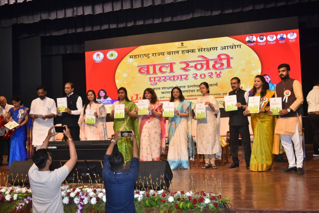 बाल संरक्षण क्षेत्रात उल्लेखनीय कार्य करणाऱ्या अधिकारी आणि यंत्रणांचा सन्मान करण्यासाठी यशवंतराव चव्हाण प्रतिष्ठान येथे राज्य बाल हक्क संरक्षण आयोगाच्यावतीने ‘बालस्नेही पुरस्कार २०२४’ समारंभाचे आयोजन करण्यात आले. यावेळी महिला व बालविकास राज्यमंत्री मेघना बोर्डीकर, राज्यमंत्री पंकज भोयर, आमदार संजय केळकर, आमदार मनीषा कायंदे, महिला व बाल अपराध प्रतिबंध विभाग पोलीस अपर महासंचालक अश्वती दोर्जे, आयोगाचे माजी आयुक्त प्रशांत नारनवरे, आयोगाचे सचिव लक्ष्मण राऊत यांच्या हस्ते पुरस्कार प्रदान करण्यात आले. अवर सचिव वंदना जैन, शिक्षण अधिकारी माधुरी भोसले, सदस्य नीलिमा चव्हाण, जयश्री पालवे, सायली पालखेडकर, संजय सिंगल, चैतन्य पुरंदरे, आदिसह जिल्हाधिकारी, मुख्य कार्यकारी अधिकारी, विभागीय आयुक्त, पोलीस अधिकारी, विविध संस्थांचे पदाधिकारी उपस्थित होते.
