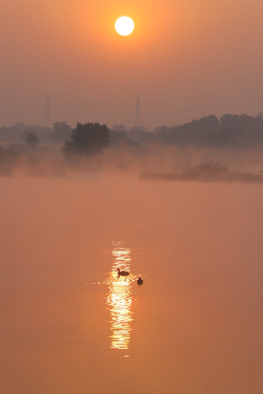 शांत जलपृष्ठावर तरंगणारे पक्षी, धुक्यात विरघळलेली नदीकाठाची रेषा आणि लालसर-केशरी आभाळात झळकणारा सूर्य — हा निसर्गाचा देखावा क्षणभर काळ थांबवणारा आहे.