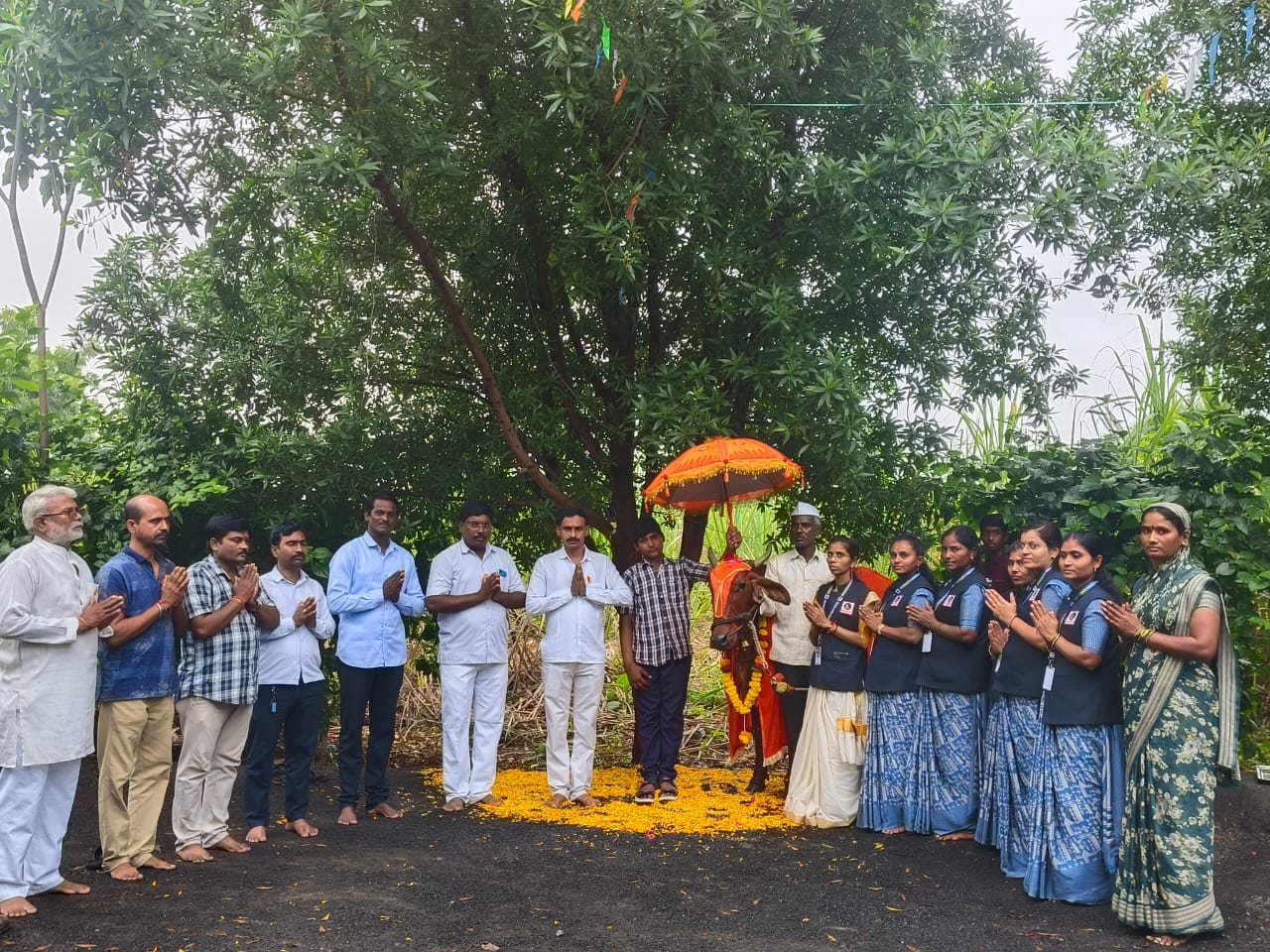 प्रथम सर्वांनी फुलांचा वर्षाव करून गोमातेचे स्वागत केले.चिमुकल्यांनी “गोमाता की जय”अश्या घोषणा देत फुले उधळून आनंद व्यक्त .