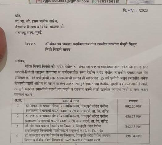 विष्णुपूरी येथील डॉ.शंकरराव चव्हाण महाविद्यालय हे जिल्ह्यातच नव्हे तर मराठवाड्यात सर्वदूर परिचित असलेले महाविद्यालय असून नांदेड जिल्ह्यासह परभणी, हिंगोली, लातूर जिल्ह्यातील तसेच तेलंगणा, कर्नाटक या परराज्यातील मोठ्या संख्येने रुग्ण दररोज उपचारासाठी दाखल होत असतात. सुमारे 15 वर्षांपूर्वीची ही जुनी इमारत असल्यामुळे इमारतीचे बांधकाम कालबाह्य होत आहे. अनेक विभागात गळती सुरु असल्याने आणि इमारतीची रंगरंगोटी नाहीशी झाल्यामुळे या इमारतीला अवकळा आली आहे. हीच बाब लक्षात घेऊन सामाजिक कार्यकर्ते, राष्ट्रवादी काँग्रेस अजितदादा गटाचे जिल्हाध्यक्ष इंजि.विश्वांभर पवार यांनी राज्याचे वैद्यकीय शिक्षण मंत्री हसन मुश्रीफ यांची 7 नोव्हेंबर 2023 रोजी भेट घेवून या महाविद्यालयाच्या इमारतीची दयनिय अवस्था त्यांच्या निदर्शनास आणून दिली.