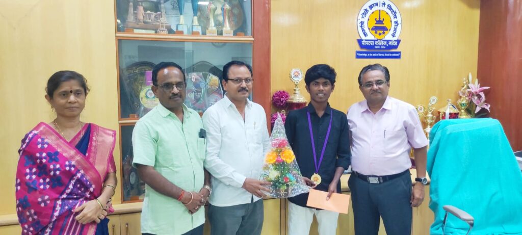 या स्पर्धेत तन्मय कॉलेजचे प्रतिनिधित्व करणार आहे. या यशाबद्दल प्रभारी प्राचार्य डॉ. शिवशंकर भानेगावकर यांनी तन्मयला मेडल प्रदान करून अभिनंदन केले. या प्रसंगी क्रीडा विभागप्रमुख प्रा. विलास वडजे, प्रा. डॉ. सुनिता माळी, प्रा. डॉ. राजेश सोनकांबळे आदी उपस्थित होते.