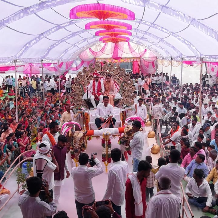 माळाकोळी येथील शेतकरी व पशुपालक कुटुंबातील रावसाहेब घुगे यांचे चिरंजीव पवन घुगे व उद्धव केंद्रे यांची कन्या ज्ञानेश्वरी केंद्रे यांचा विवाह ७ मार्च रोजी पार पडला. या विवाह सोहळ्यात पारंपरिक संस्कृतीला उजाळा देत वर-वधूची वरात सजविलेल्या खिल्लाऱ्या बैलगाडीतून काढण्यात आली.