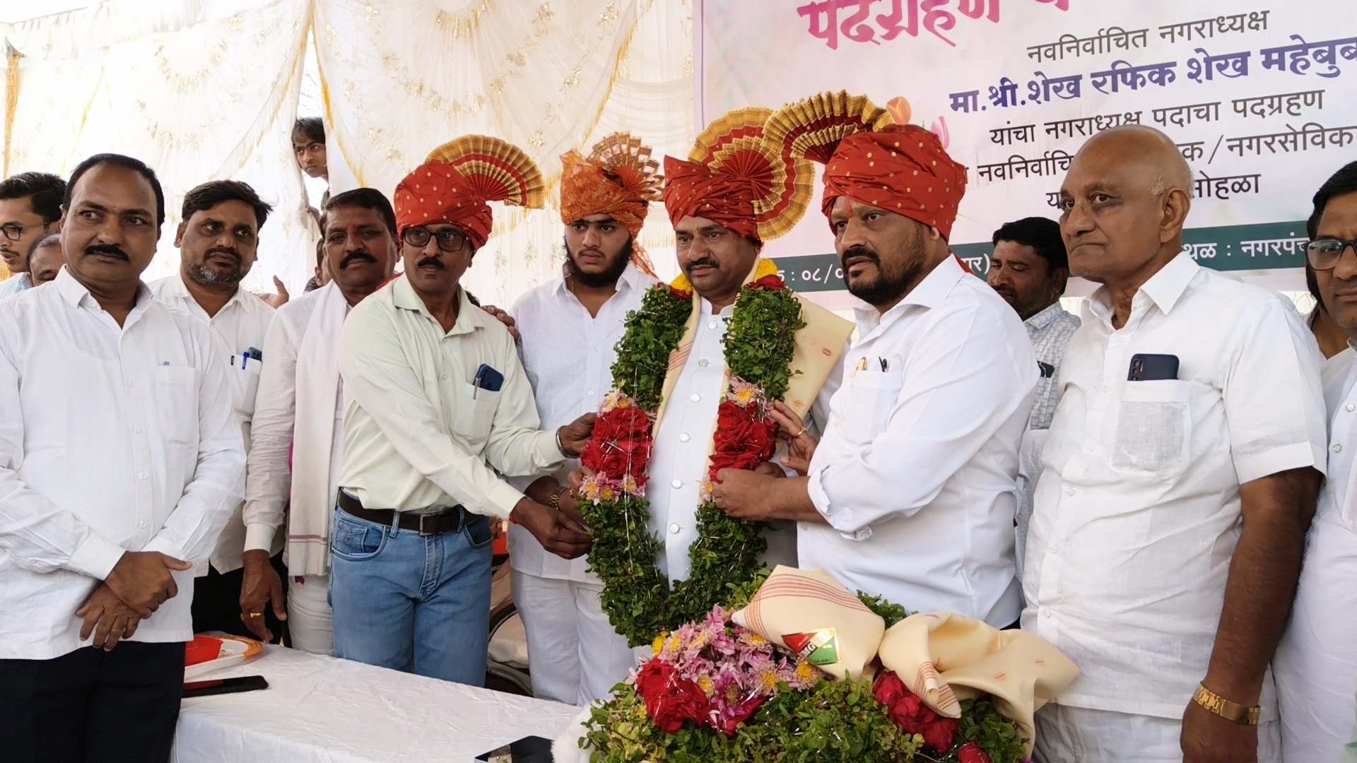 कार्यक्रमाच्या प्रारंभी नगरपंचायतीचे प्रभारी मुख्याधिकारी श्री. ताडेवाड यांच्या हस्ते नगराध्यक्ष शेख रफिक शेख महेबूब यांच्यासह सर्व मान्यवर व नवनिर्वाचित नगरसेवकांचा स्वागत-सन्मान करण्यात आला. त्यानंतर लोकनियुक्त नगराध्यक्ष शेख रफिक सेठ यांनी विधिवत पदभार स्वीकारला. या ऐतिहासिक क्षणाचे साक्षीदार होण्यासाठी शहरासह ग्रामीण भागातून नागरिकांनी मोठी गर्दी केली होती.