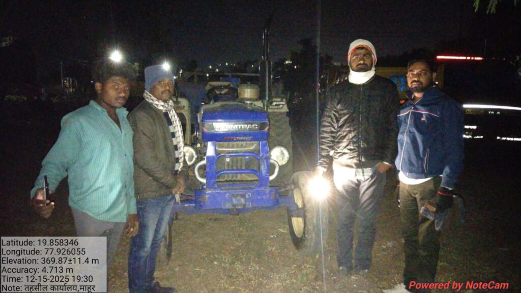 तालुक्यात अनेक ठिकाणी पैनगंगा नदी पात्रावर बैठ्या पथकांची नेमणूक झाल्याने अनेक वाळू तस्कर नाल्यावरून वाळू चोरी करण्याचा प्रयत्न करत असल्याची माहिती मिळत असल्याने याआधी अनेक ठिकाणी ट्रॅक्टर पकडून तहसील कार्यालयात जमा करण्यात आले आहेत तर दि 15 रोजी रात्री तहसीलदार अभिजीत जगताप नायब तहसीलदार कैलास जेठे यांच्या मार्गदर्शनाखाली फिरत्या पथकात गस्तीवर असलेले ग्राम महसूल अधिकारी पवन यादव मनोहर चेके सुनील वनवे ओमप्रकाश तवर कोतवाल बंडू चिरंगे विलास शेळके संदीप रणमले हे कुपटी ते साकुर रस्त्यावर गस्त घालत असताना नाल्यातून वाळू भरून बाहेर आलेला विना नंबरचा फार्मट्रेक कंपनीचा ट्रॅक्टर दिसल्याने त्यास अडवून पाहणी केली असता त्यामध्ये विनापरवानगी वाळू भरून वाहतूक करत असलेला आढळून आल्याने त्यास तत्काळ पकडून माहूरच्या तहसील कार्यालयात आणून पाच लाखाचा मुद्देमाल जप्त करण्यात येऊन त्यावर महसूल सहाय्यक वैभव घोडे यांनी तहसीलदार अभिजीत जगताप यांच्या मार्गदर्शनाखाली कायदेशीर कारवाईसाठी प्रस्ताव पाठविला आहे