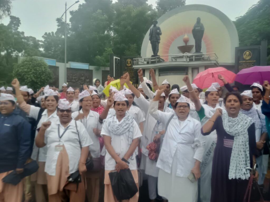 नांदेड l राष्ट्रीय आरोग्य अभियानातील मागील २३ वर्षापासून कार्यरत करार तत्वावरील कर्मचाऱ्यांना शासन सेवेत सामावून घेण्याचा निर्णय घेऊन सुद्धा अद्यापही याची अंमलबजावणी न करणे व आरोग्य कर्मचारी संघटनेच्या मागण्यांकडे डोळे झाक करणे या बाबीस कंटाळून राष्ट्रीय आरोग्य अभियानातील अधिकारी व कंत्राटी कर्मचारी एकत्रितपणे सामुहिकरित्या लक्षवेधी मोर्चा काढून शासनाकडे आपला निषेध नोंदविला.
