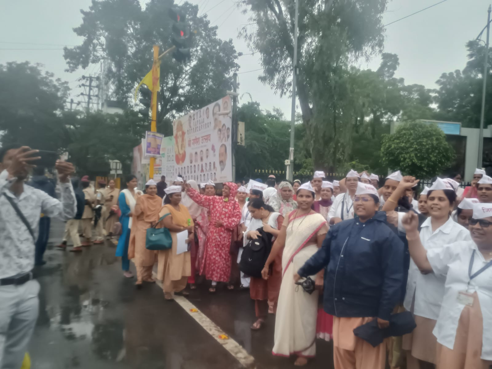 भर पावसात आय टी आय पासून , अण्णा भाऊ साठे चौक ते जिल्हाधिकारी कार्यालय पर्यंत जिल्ह्यातील दोन हजार आरोग्य खात्यातील करार तत्वावरील कर्मचारी व अधिकारी यांनी घोषणांचा पाऊस पाडला.