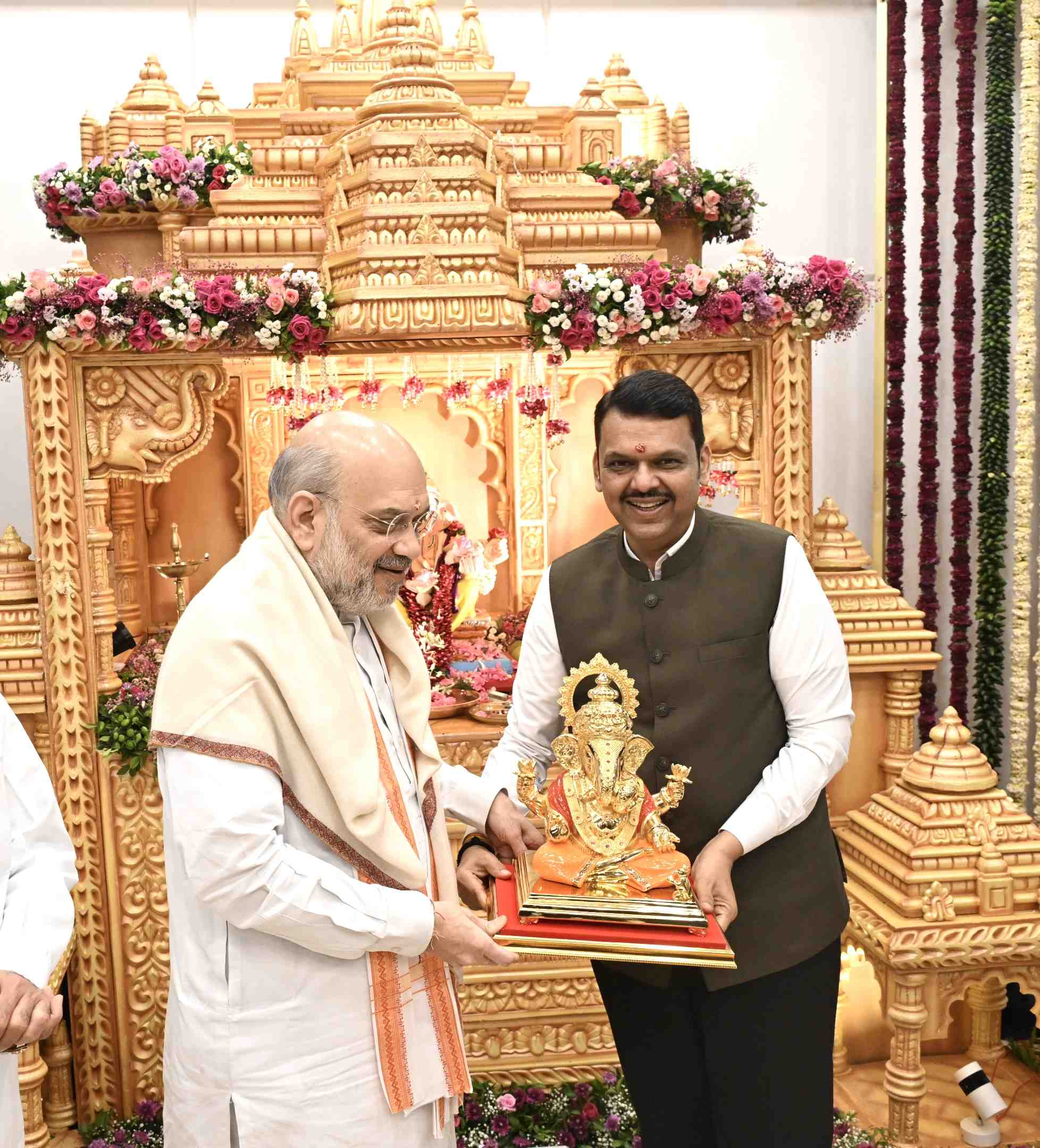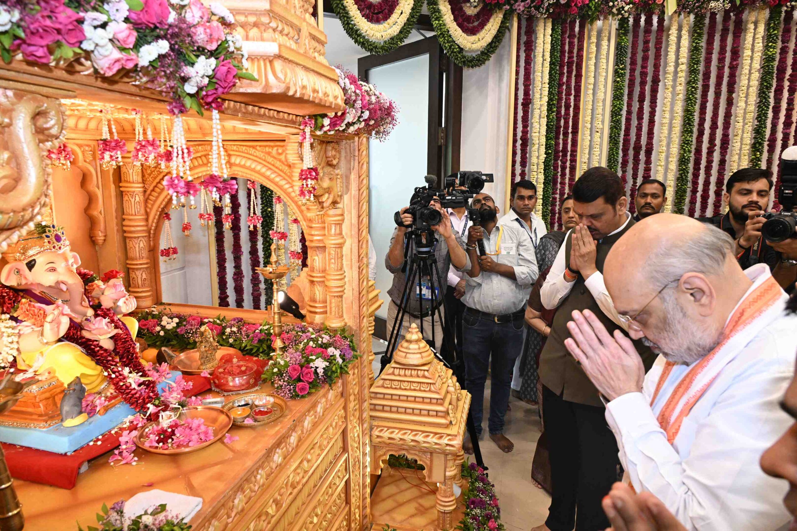 मुंबई| मुख्यमंत्री देवेंद्र फडणवीस यांच्या वर्षा या शासकीय निवासस्थानी केंद्रीय गृहमंत्री अमित शाह यांनी सपत्निक भेट देवून श्री गणरायाचे दर्शन घेतले. यावेळी मुख्यमंत्री श्री. फडणवीस यांनी श्री. शाह यांचे गणेश मूर्ती शाल, श्रीफळ तसेच पुष्पगुच्छ देऊन स्वागत केले.