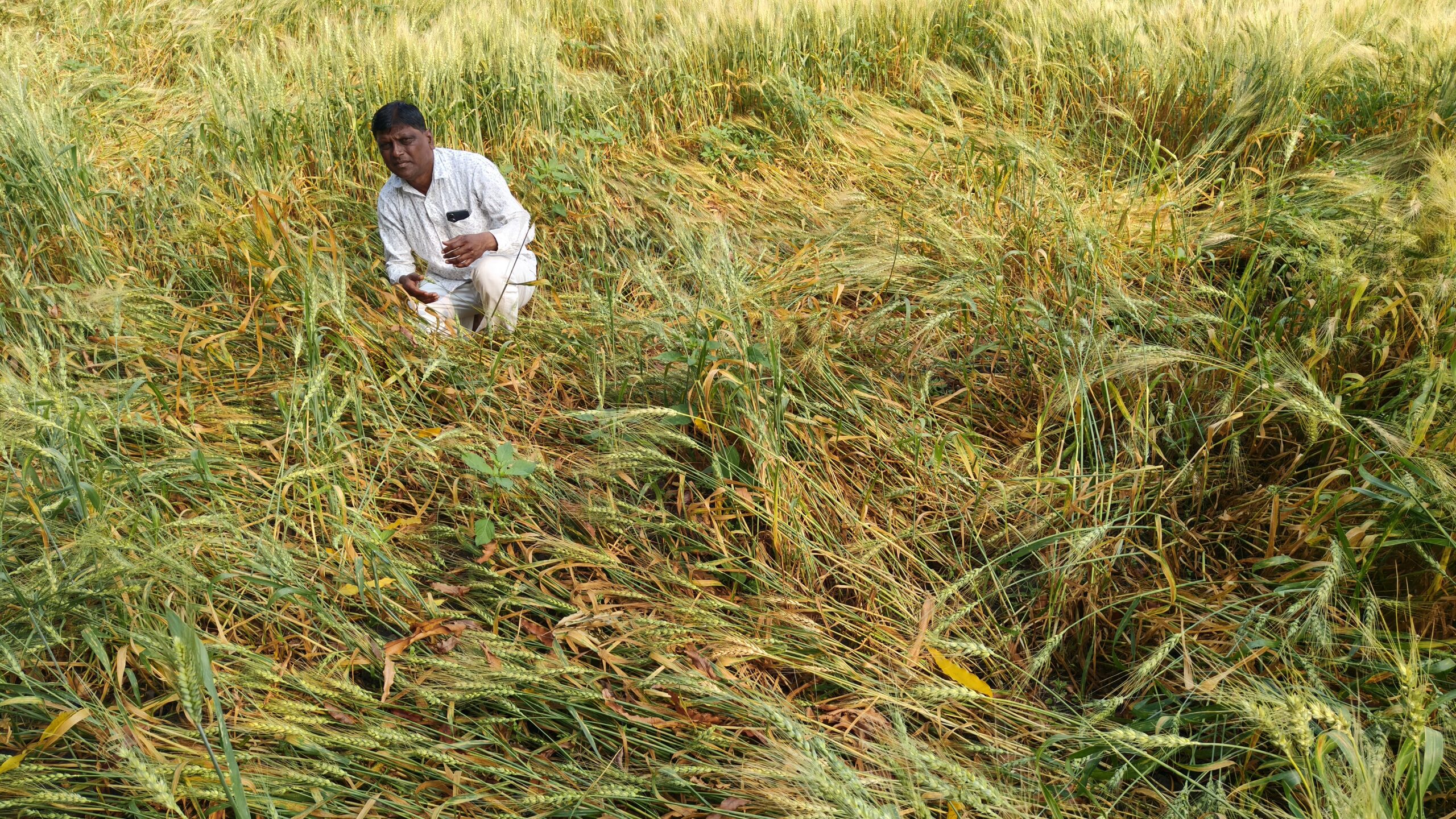 हिमायतनगर, अनिल मादसवार| तालुक्यासह परिसरात सोमवारी मध्यरात्री अचानक सुरू झालेल्या वादळी वाऱ्यासह अवकाळी पावसाने शेतीपिकांचे मोठे नुकसान झाले आहे. रब्बी हंगामातील गहू व हरभरा ही पिके पावसाच्या तडाख्यामुळे आडवी पडली असून अनेक ठिकाणी शेतात पाणी साचल्याने पिकांची अवस्था बिकट झाली आहे.