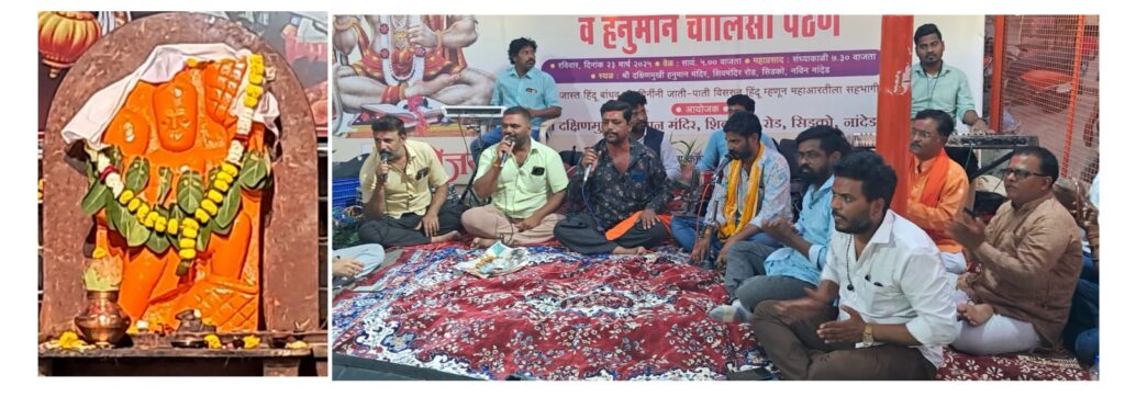सिडको शिवमंदिर समोर असलेल्या श्री दक्षिण मुखी हनुमान मंदिर येथे दि 23 मार्च रोजी तिसऱ्या वर्धापनदिन निमित्त सकाळी सतीश गुरू यांच्या अधिपत्याखाली विश्वस्त भगवान नवघरे पाटील यांच्या हस्ते अभिषेक आरती व संध्याकाळी श्री .बागेश्वर भजनी मंडळ नांदेड यांच्या वतीने भव्य भजन संध्याचे आयोजन करण्यात आले होते.